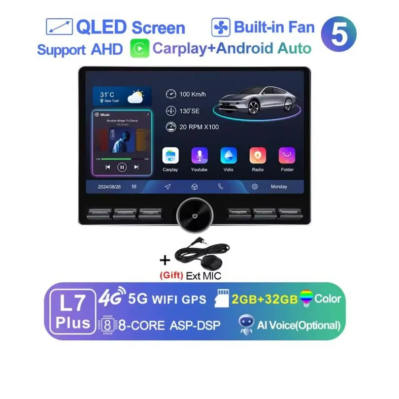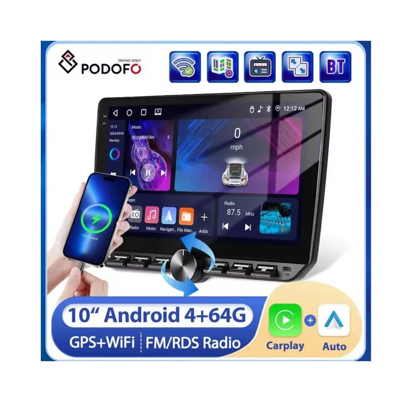 Powered by a fast Android system, it supports Apple CarPlay and Android Auto, along with Bluetooth, USB, Wi-Fi, GPS, and rear camera input.